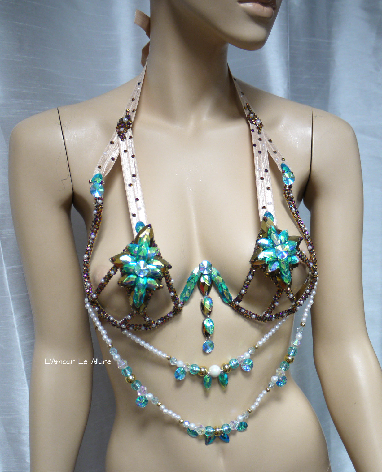 Turquoise and Gold Rihanna Diamond Samba Bra Cosplay Dance Costume Rave Bra Halloween Burlesque Show Girl