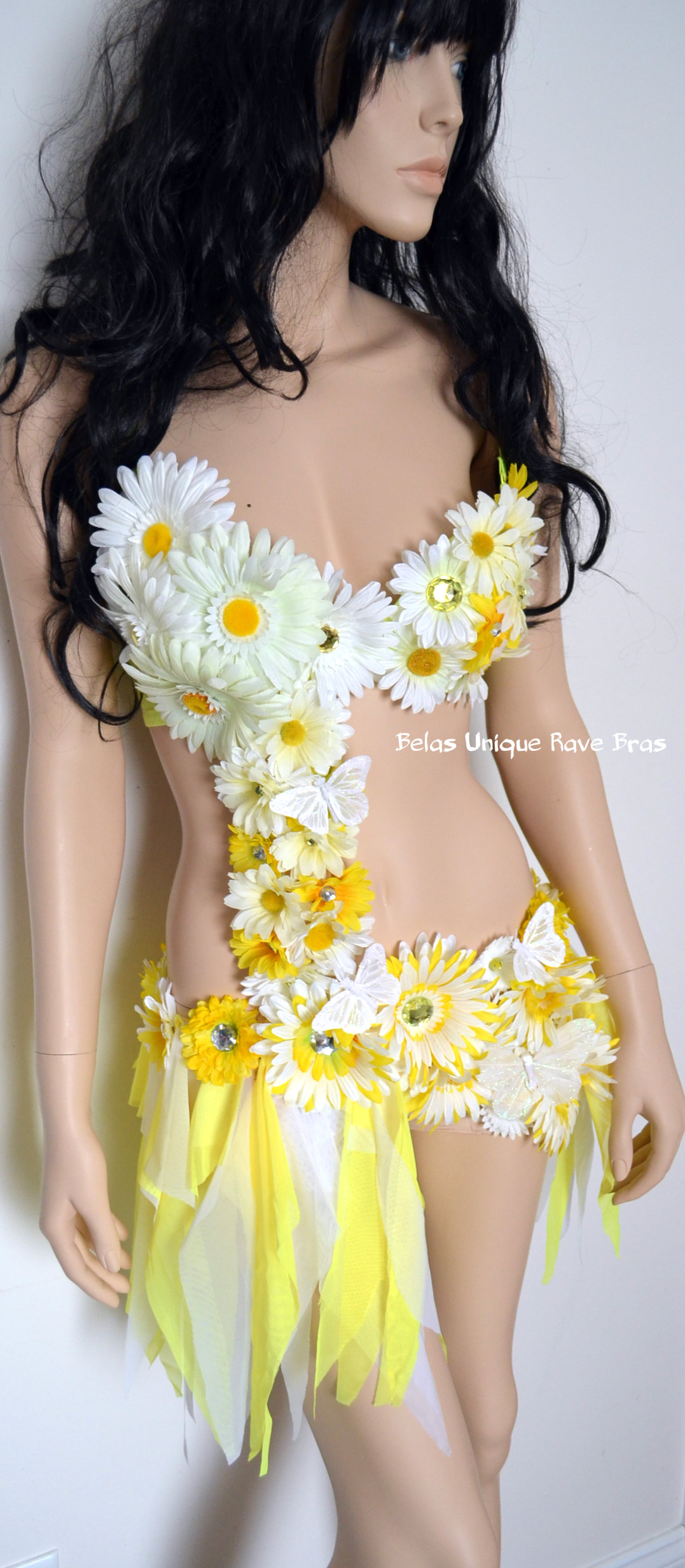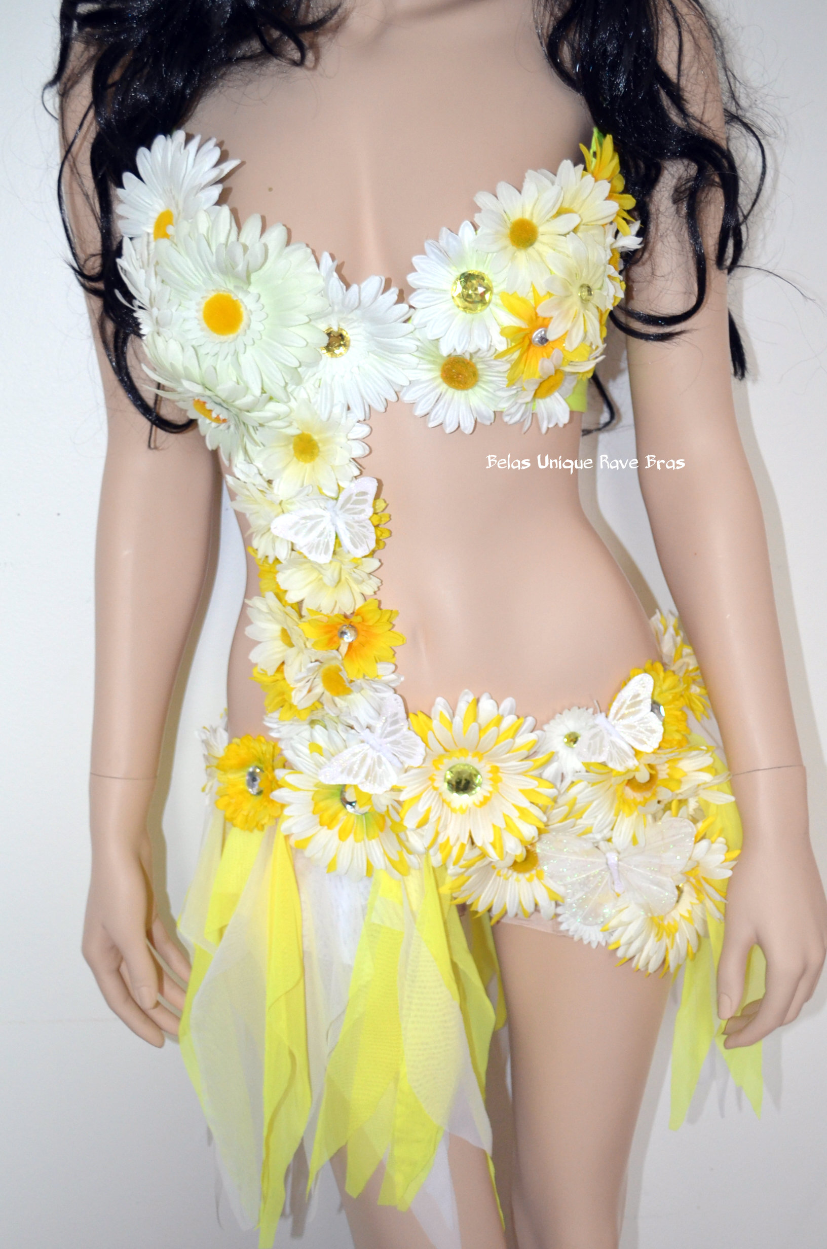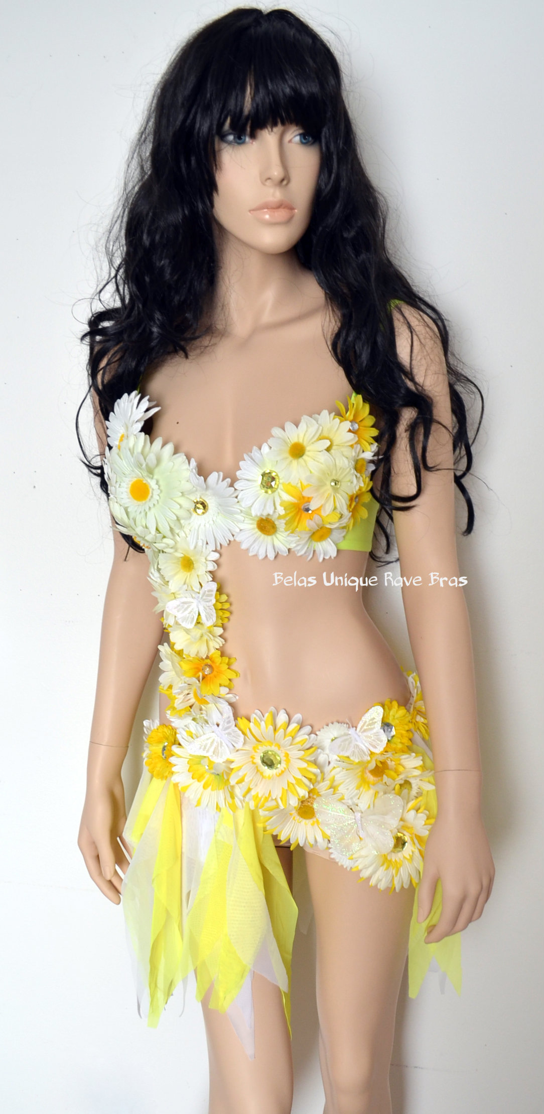 Yellow and White Daisy Fairy Monokini Costume Cosplay Dance Rave Bra Halloween Burlesque Show Girl