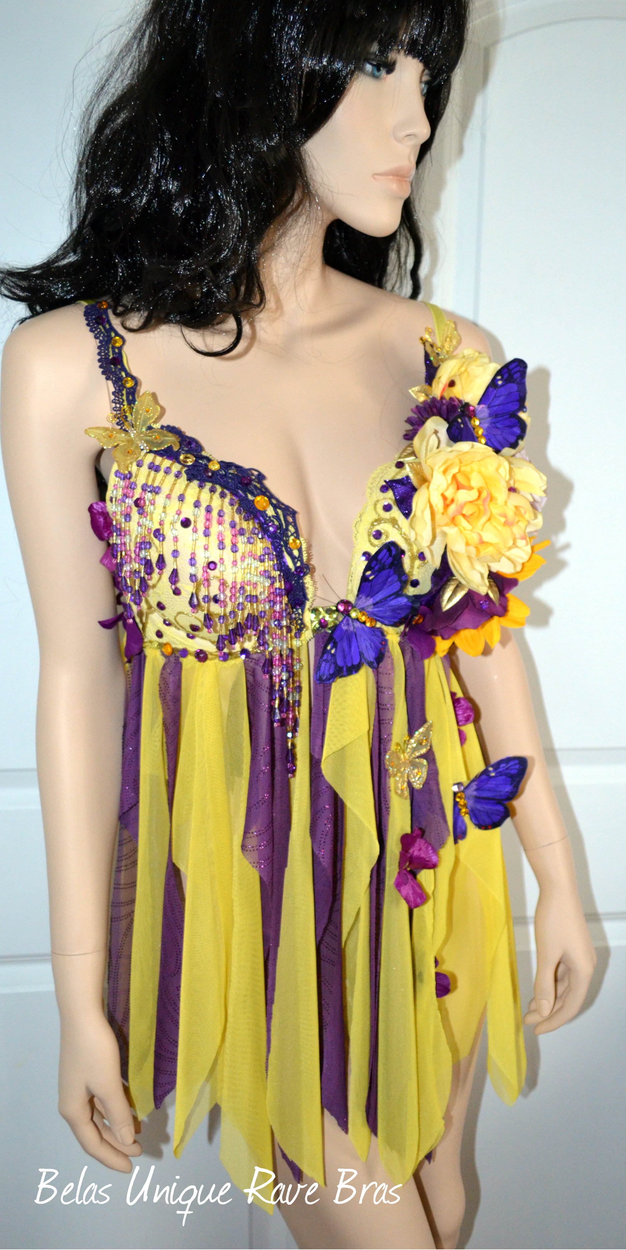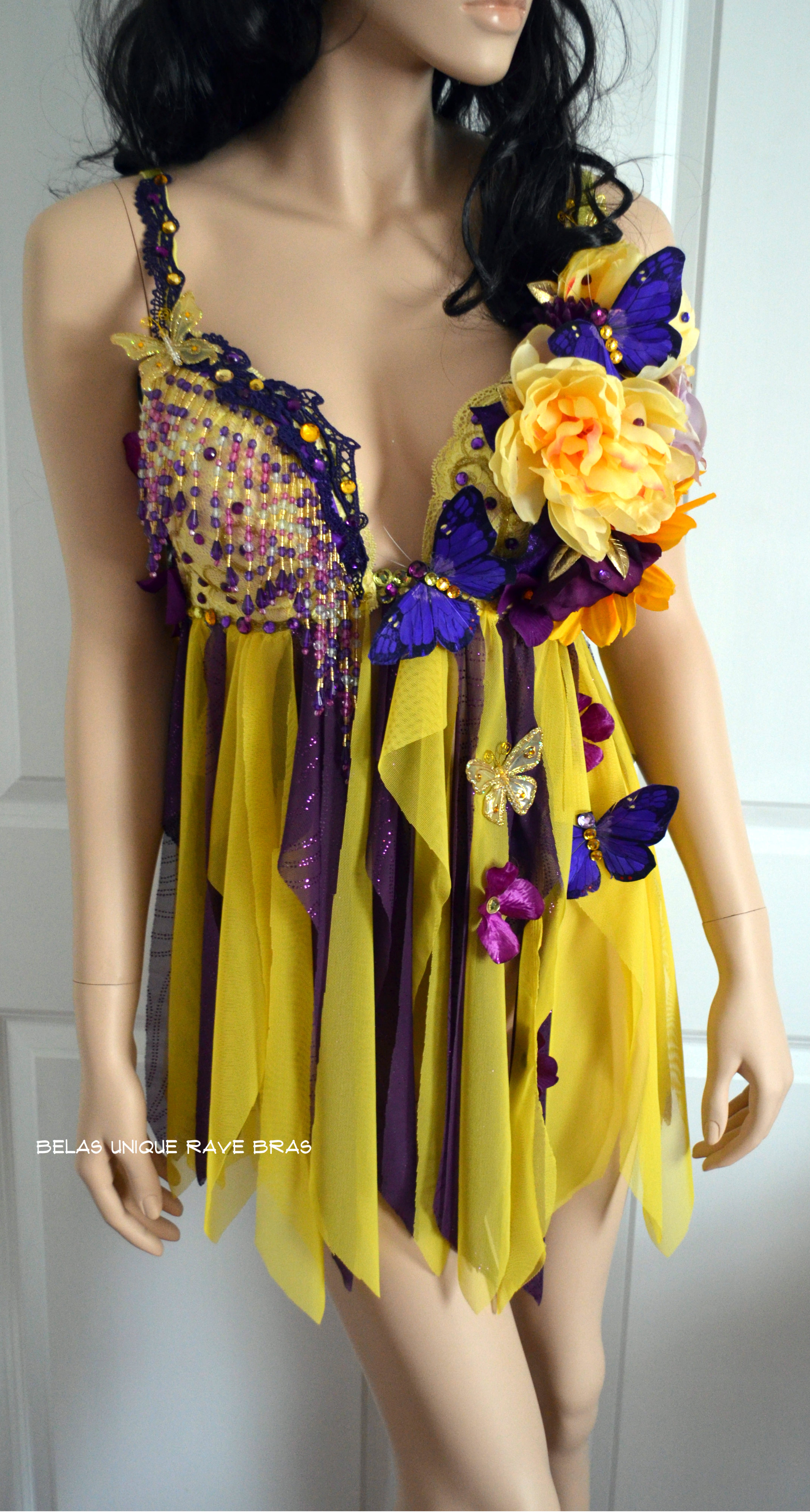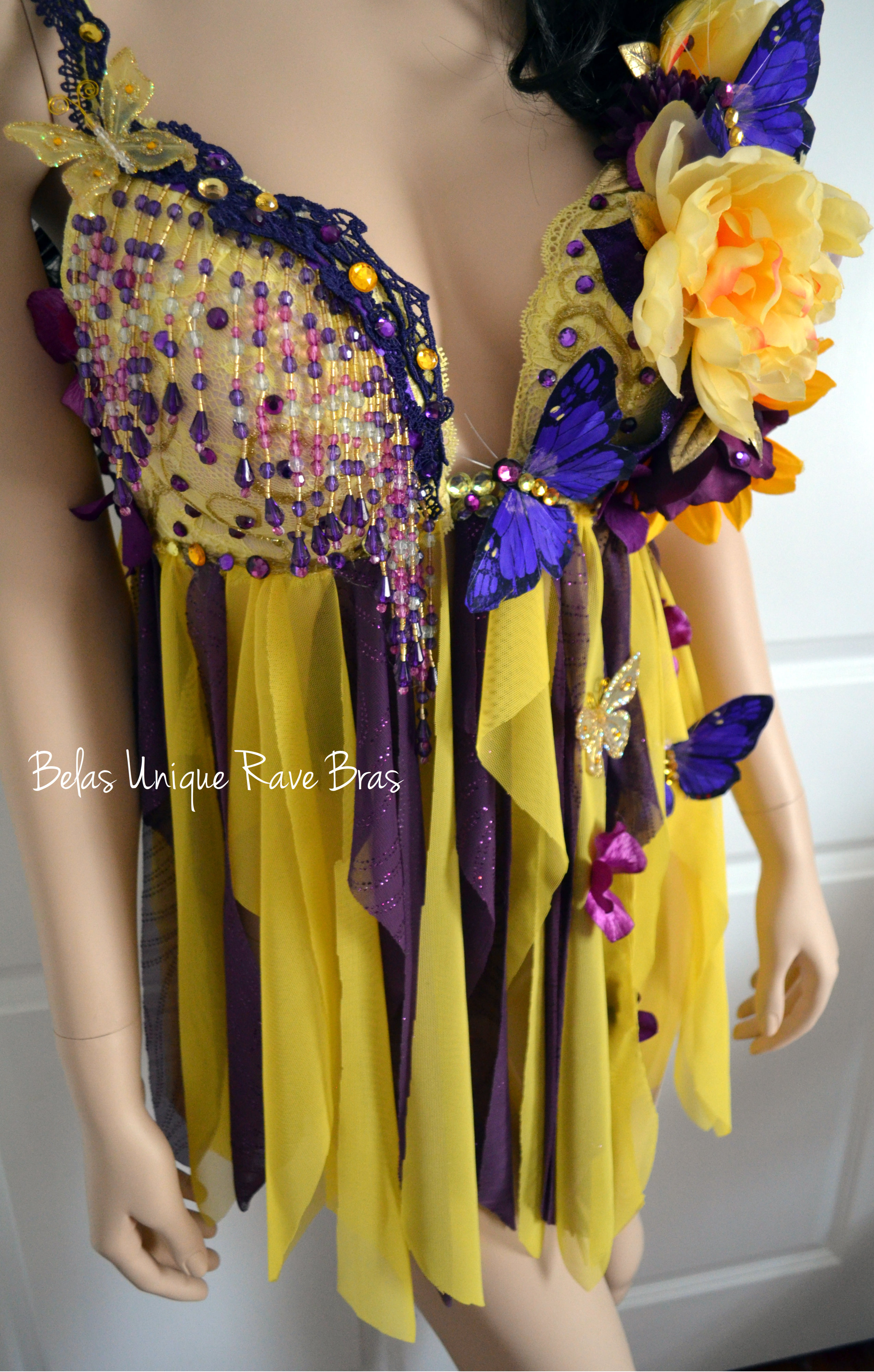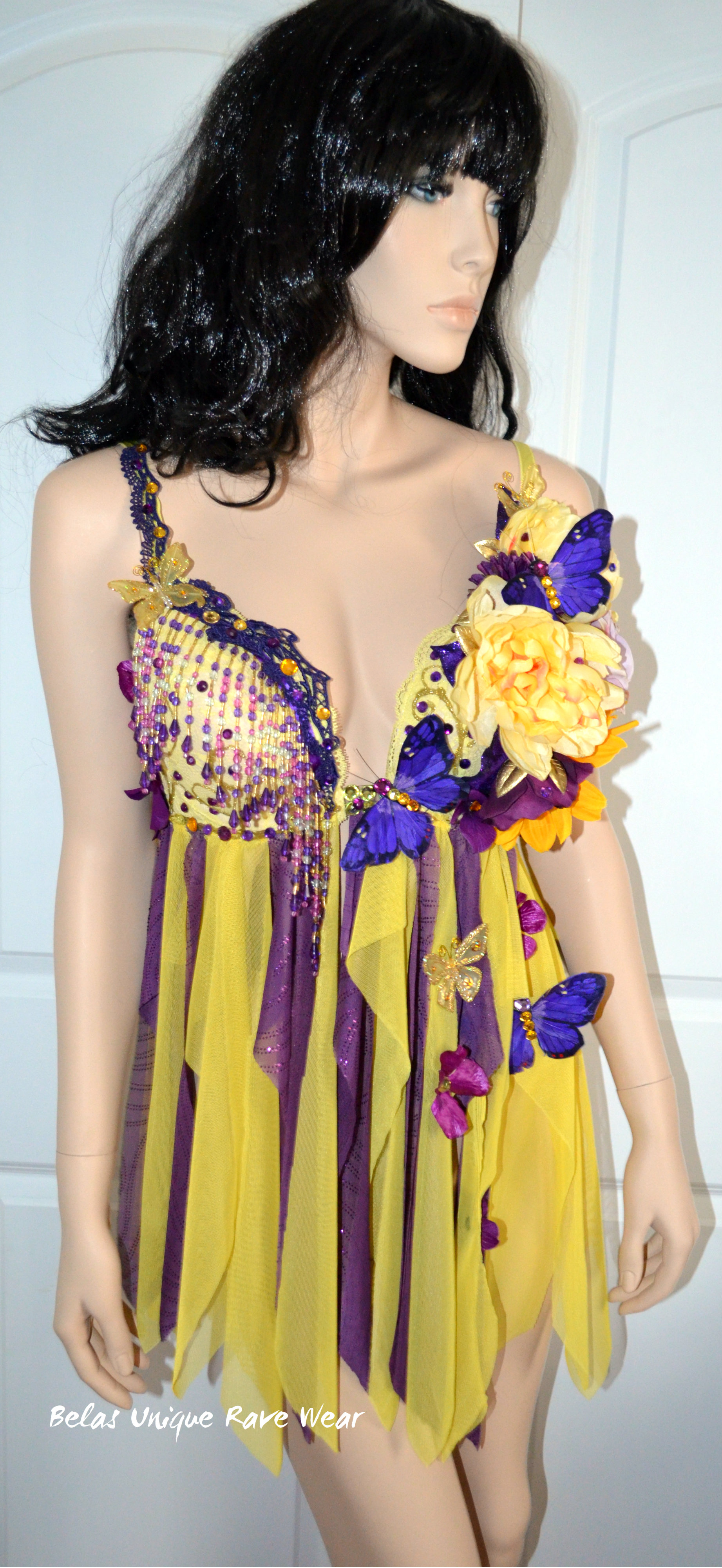 Purple and Yellow Flower Fairy Babydoll Dress Bra Costume Cosplay Dance Rave Halloween Burlesque Show Girl