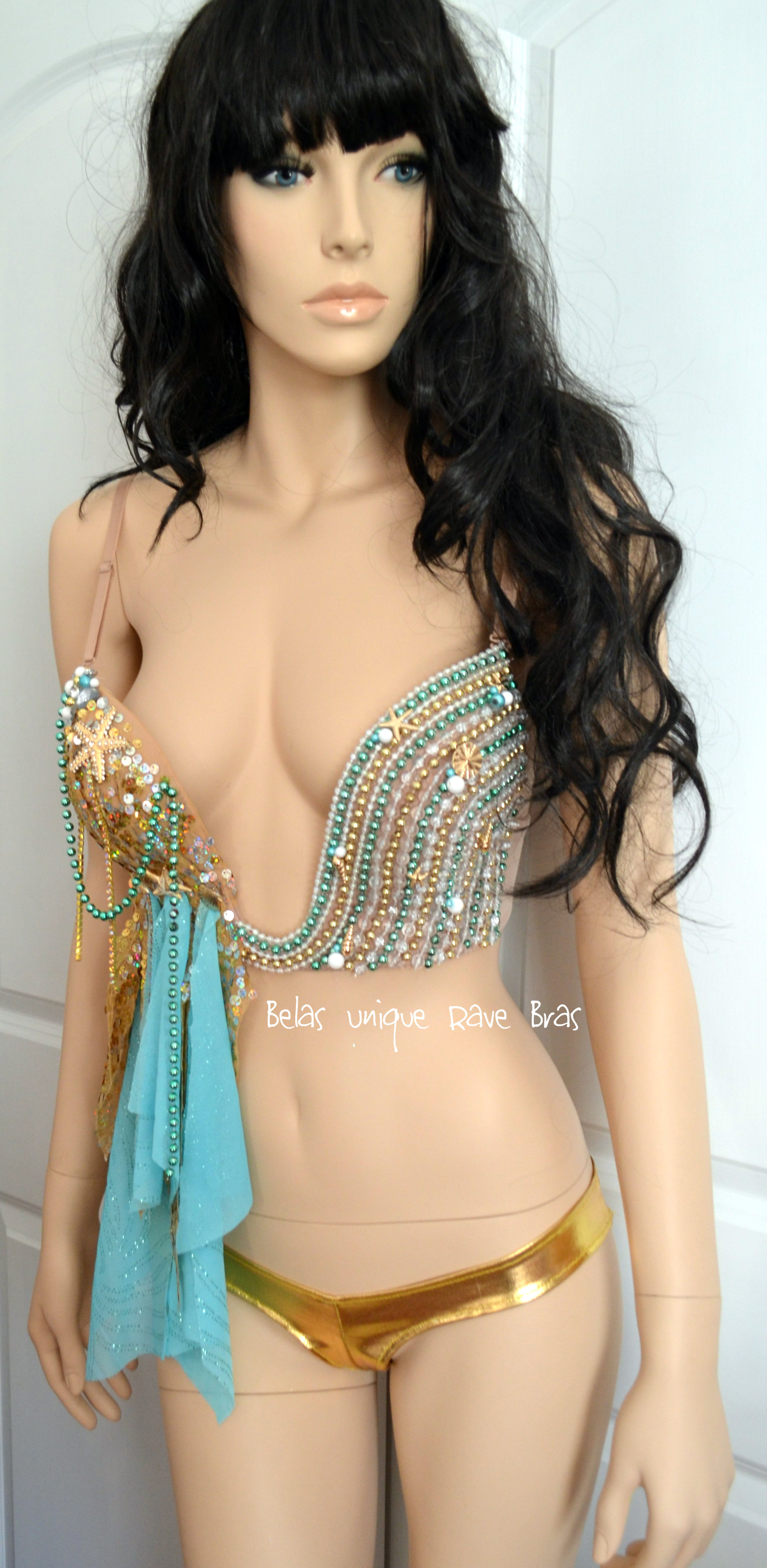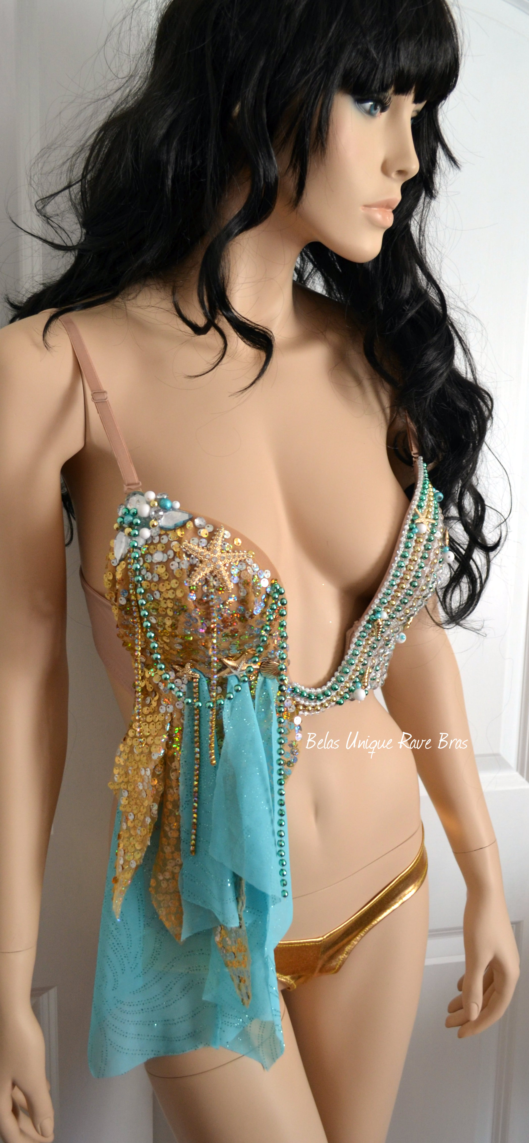 Gold Turquoise Plunge Mermaid Bra Cosplay Dance Costume Rave Bra Rave Wear Halloween Burlesque Show Girl
