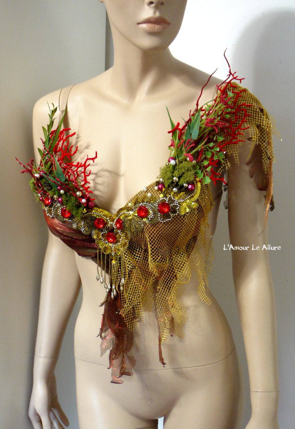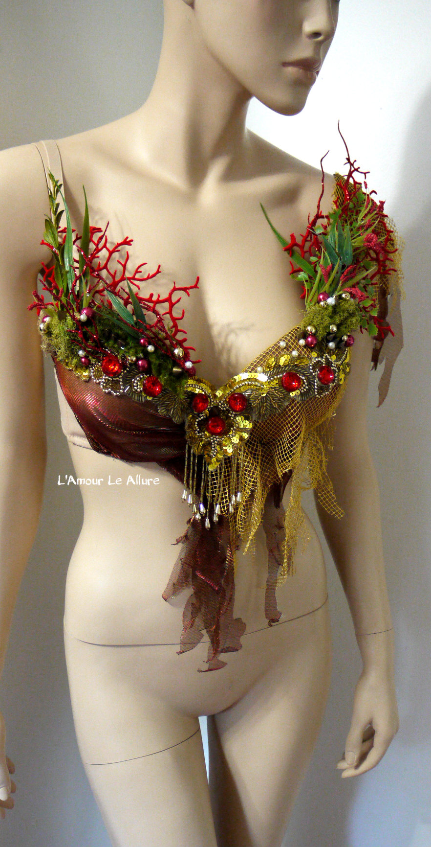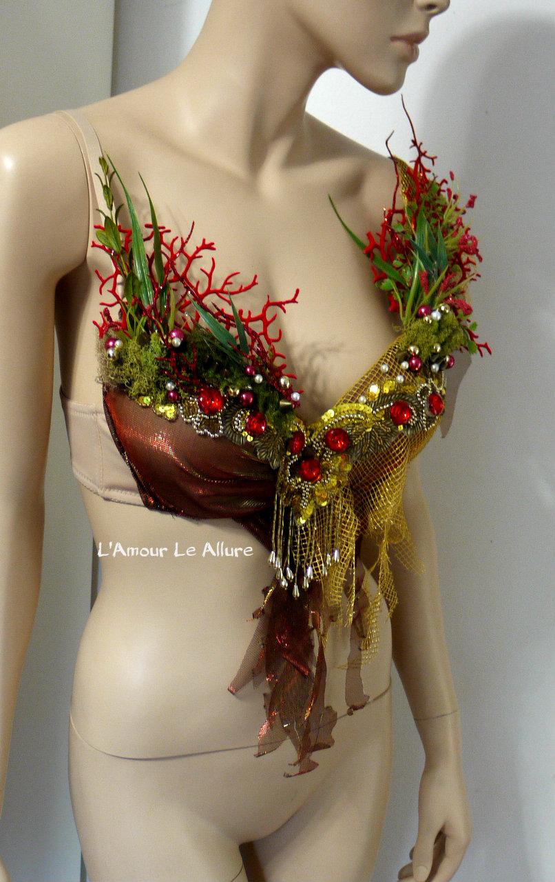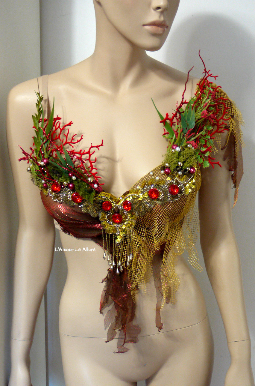 Red Gold Siren Mermaid Shell Bra Cosplay Dance Costume Rave Bra Rave Wear Halloween Burlesque Show Girl