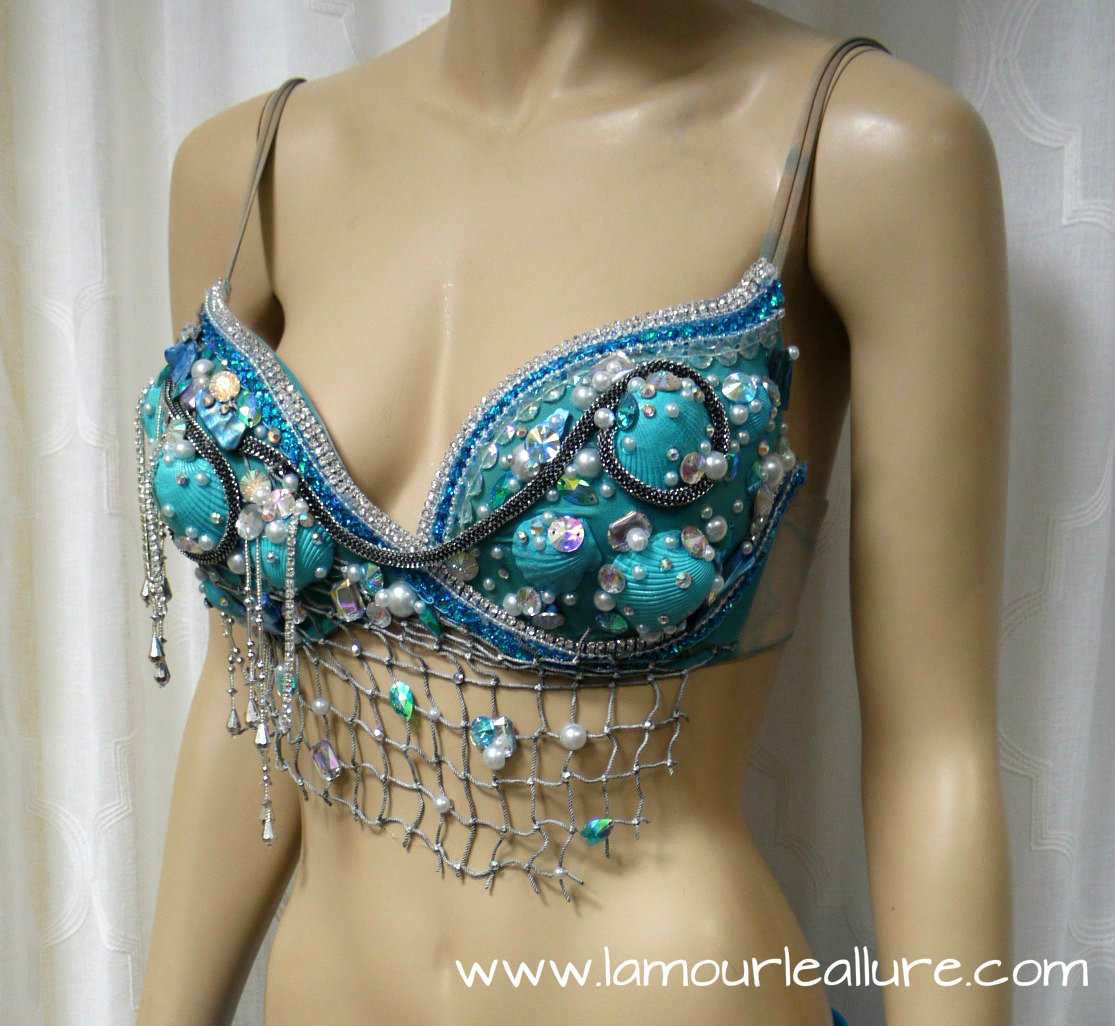 Turquoise Shell Mermaid Bra Top Cosplay Dance Costume Rave Bra Rave Wear Halloween Burlesque Show Girl