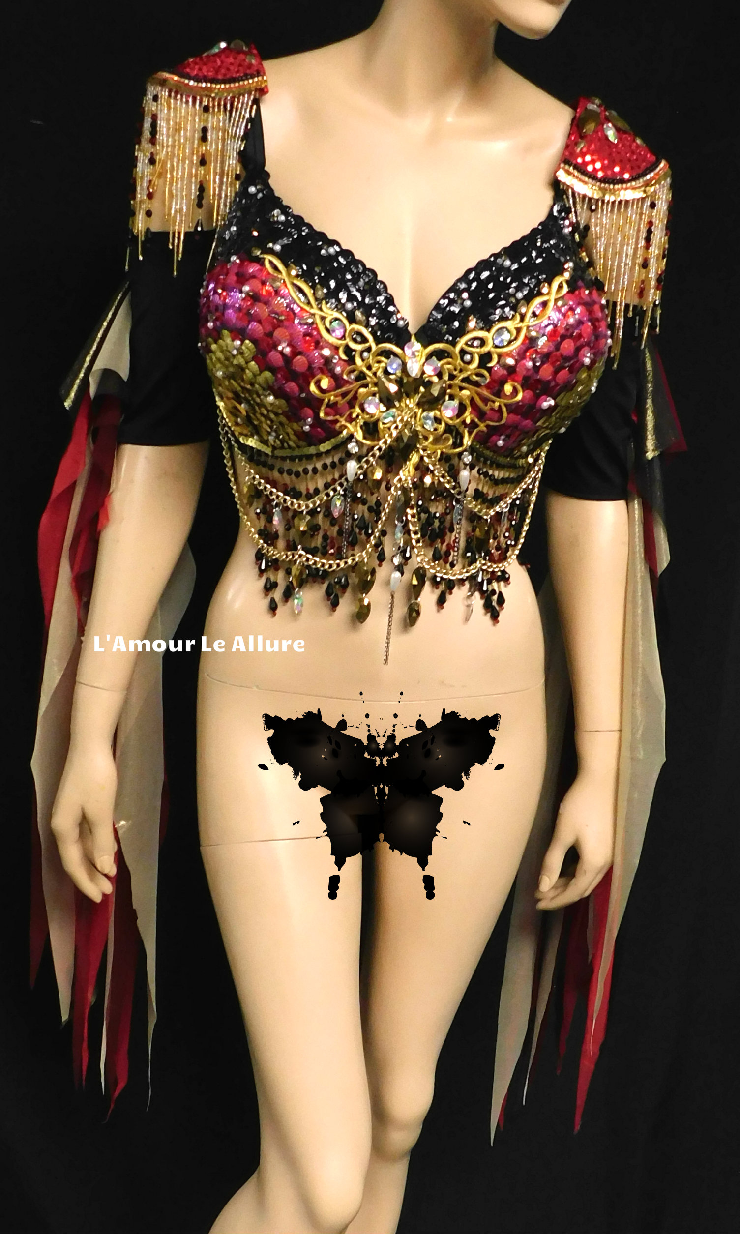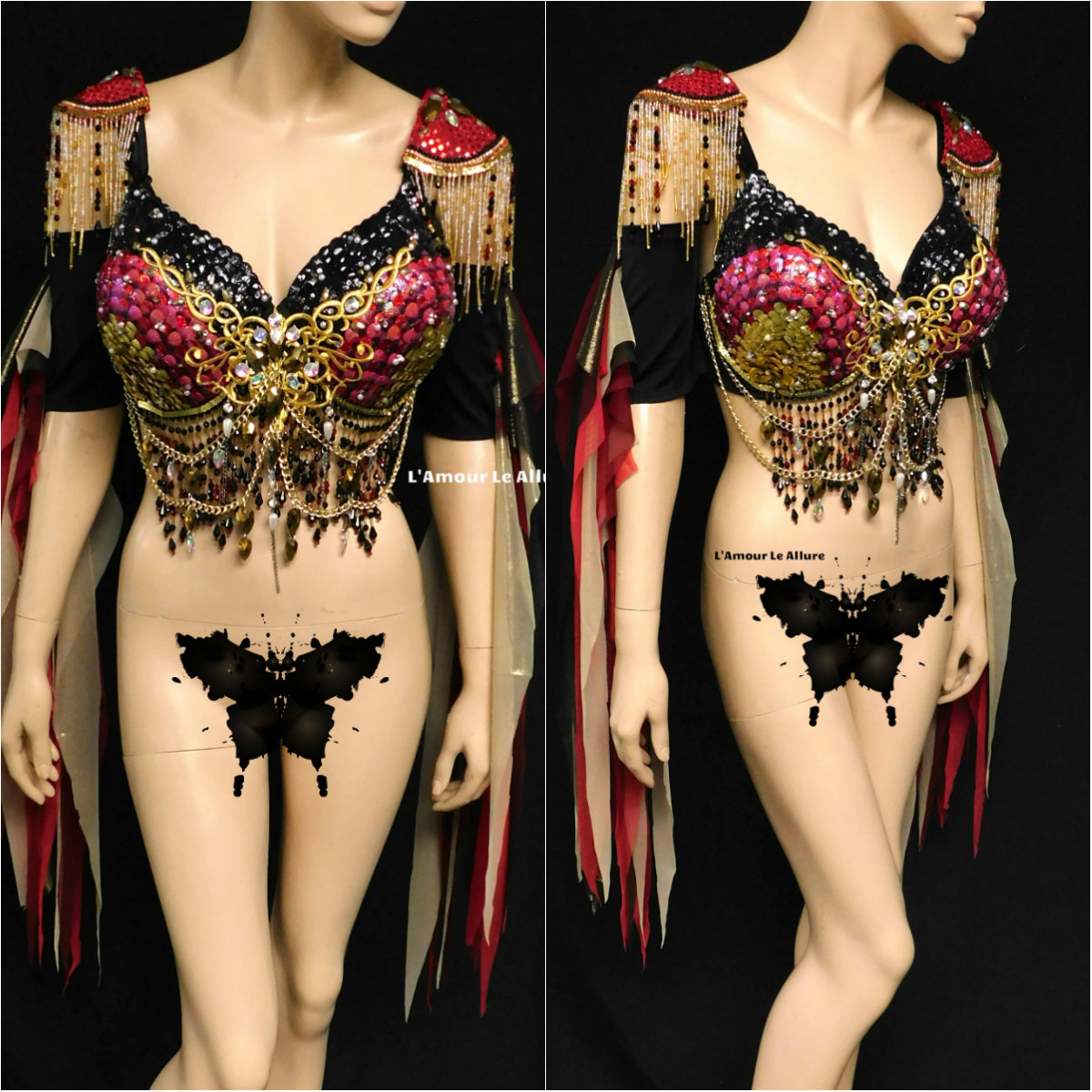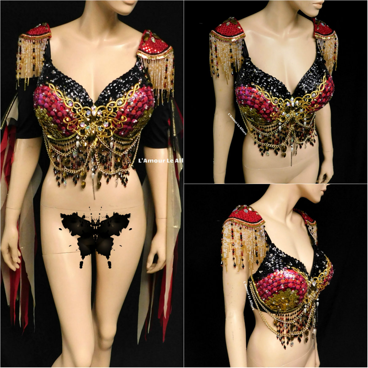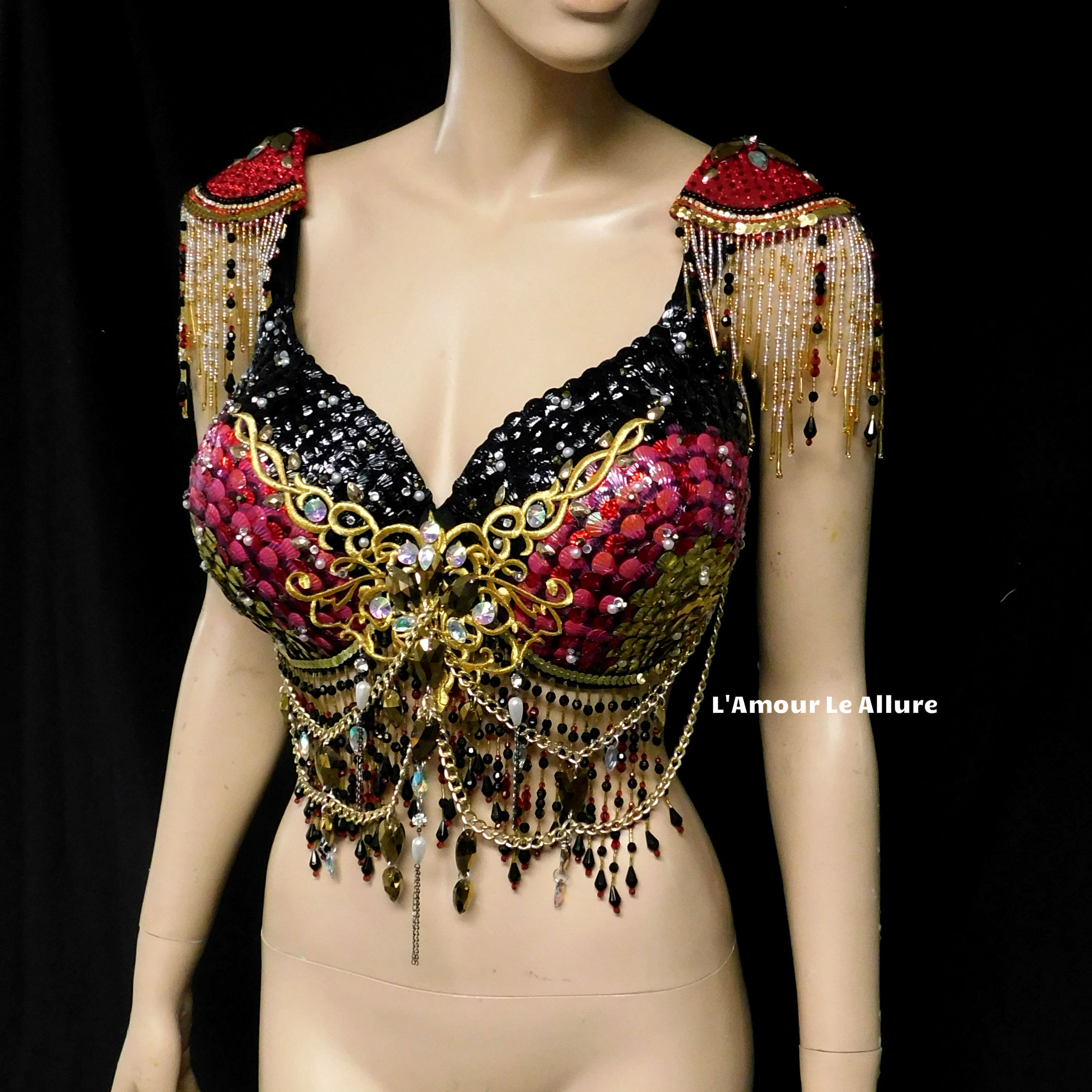 Royal Gold Black and Red Sequin Scale Mermaid Dance Costume Rave Bra Halloween