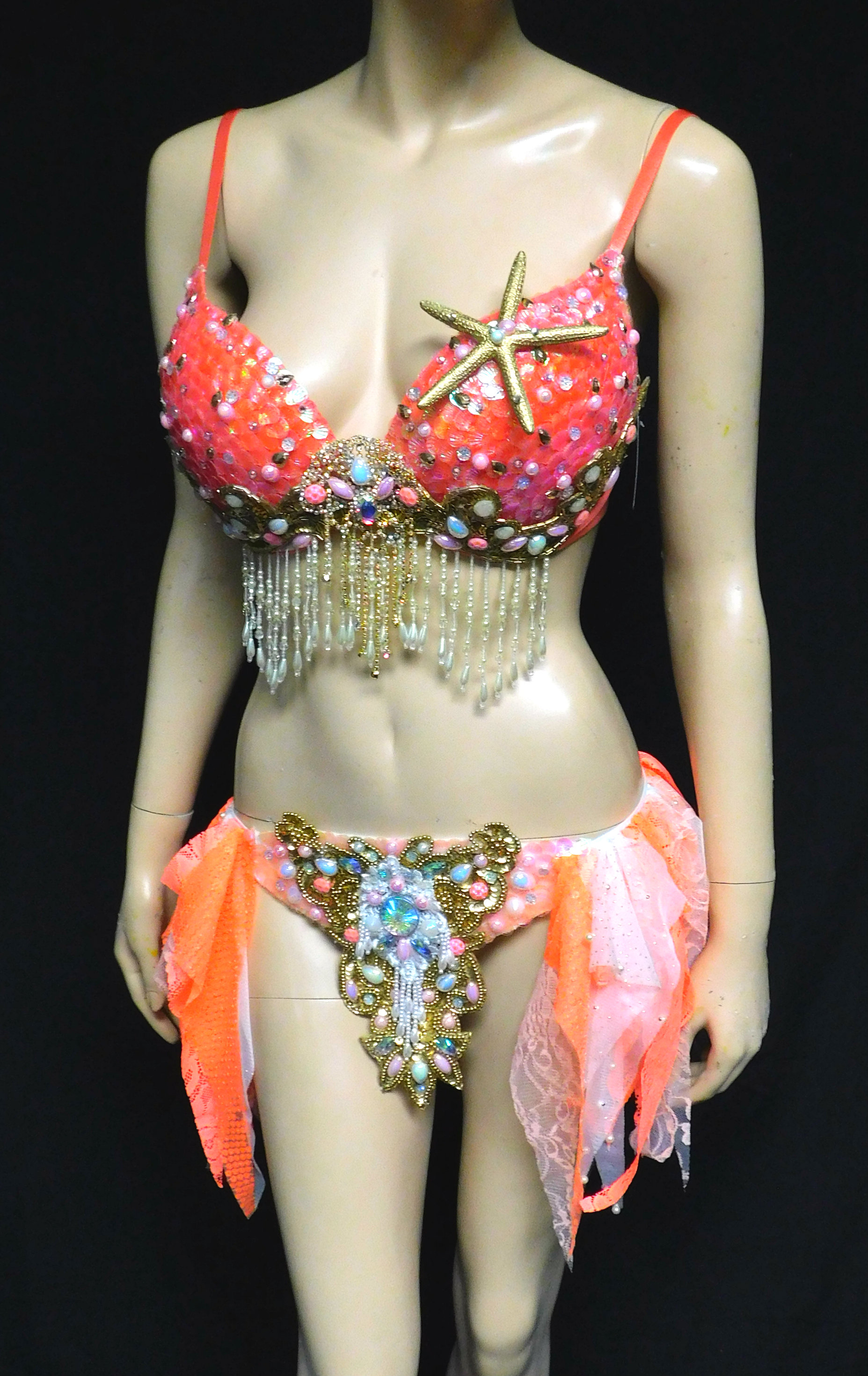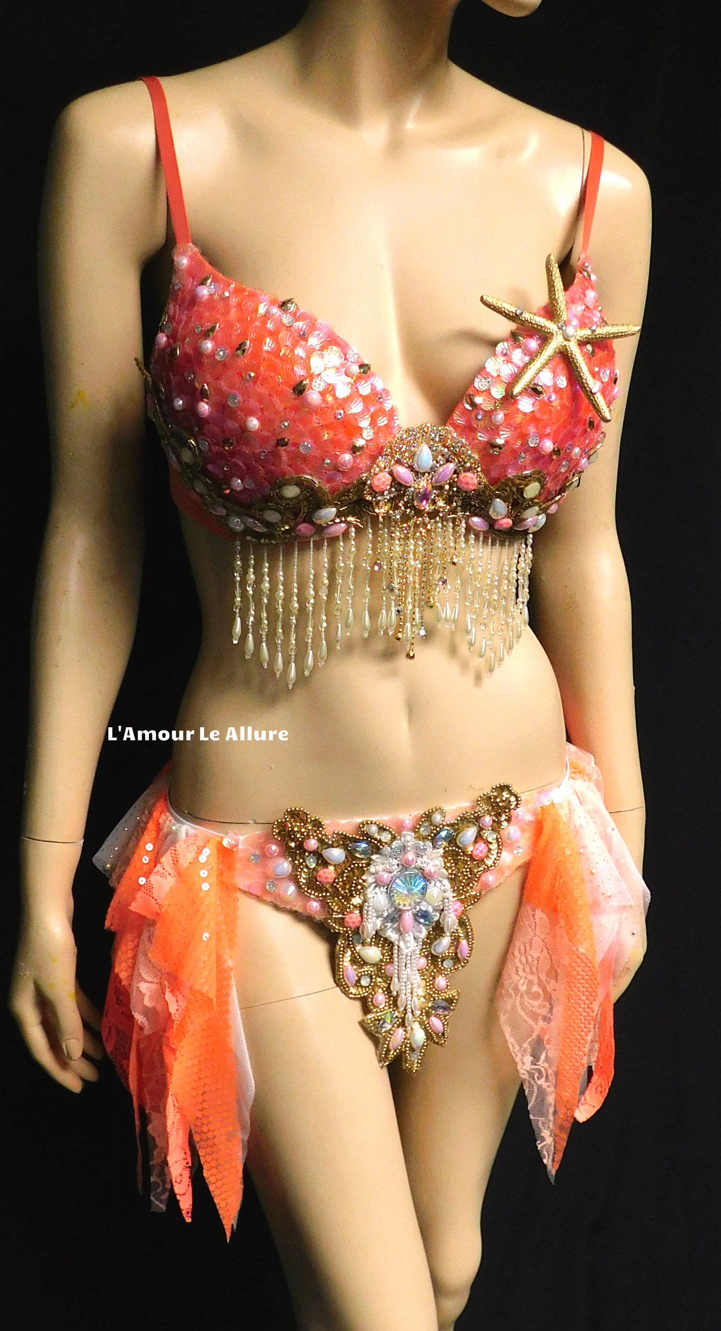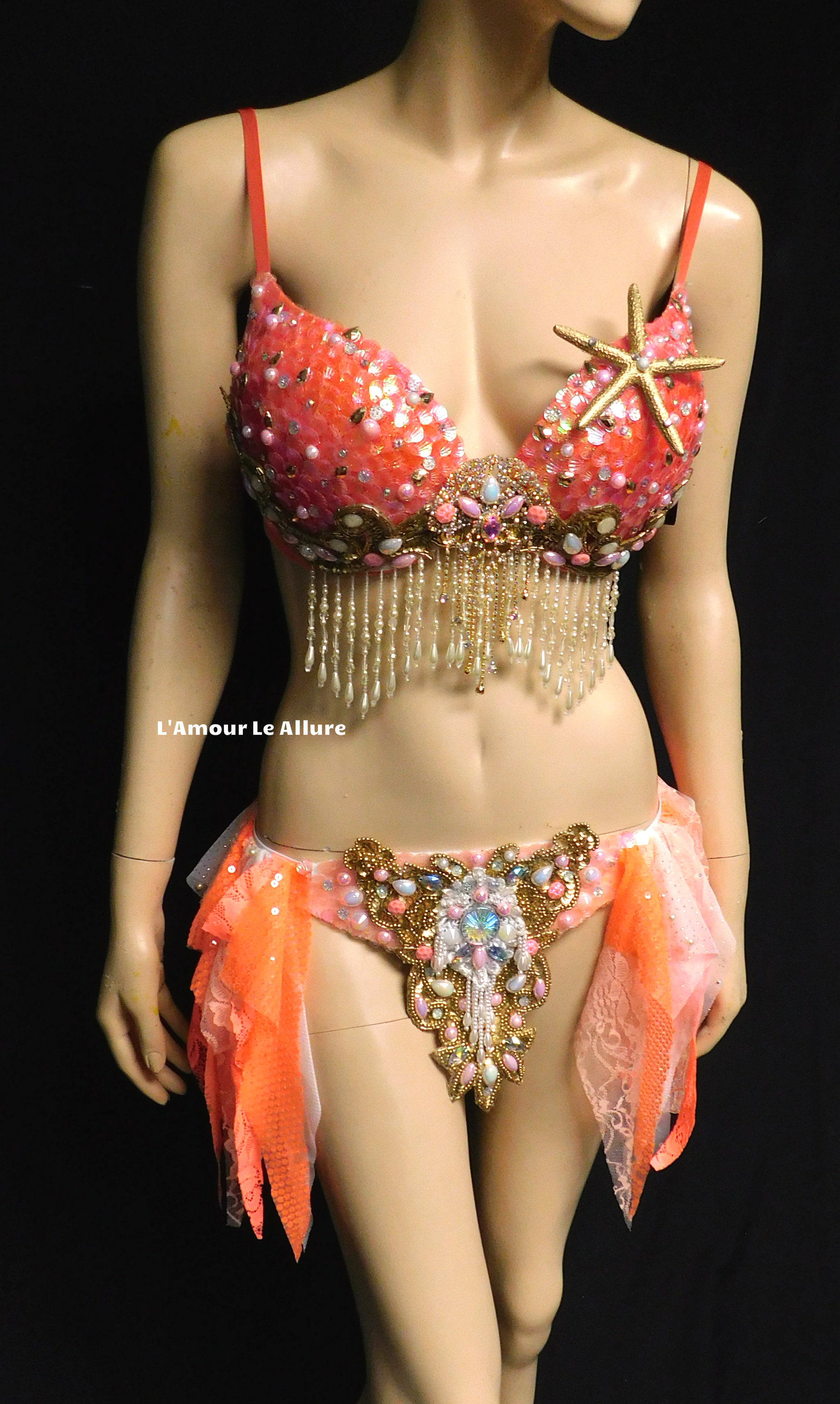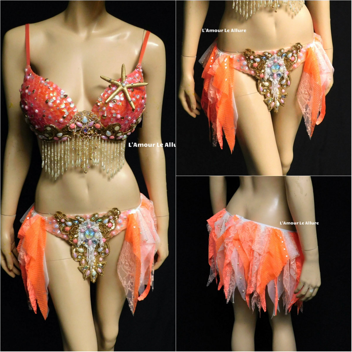 Salmon Pink Sequin Gold Scale Mermaid Dance Costume Rave Bra Halloween