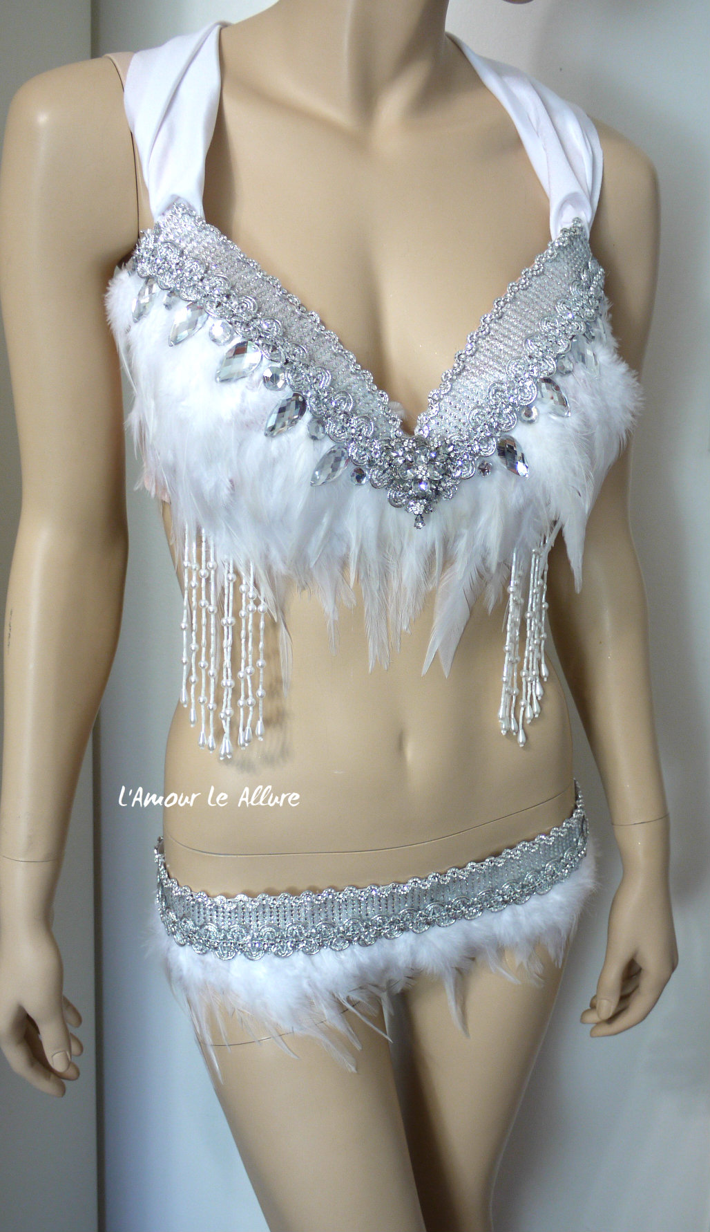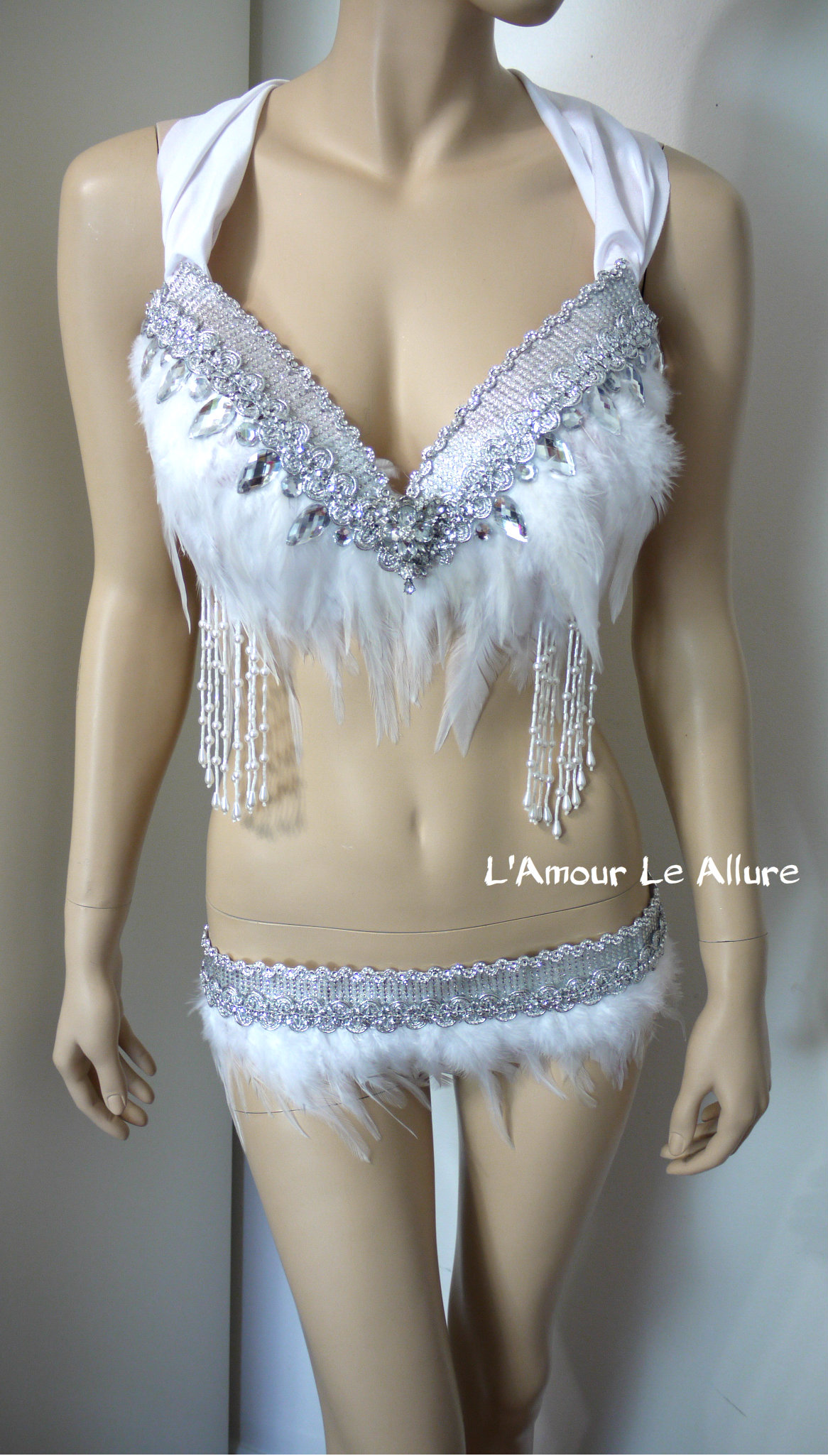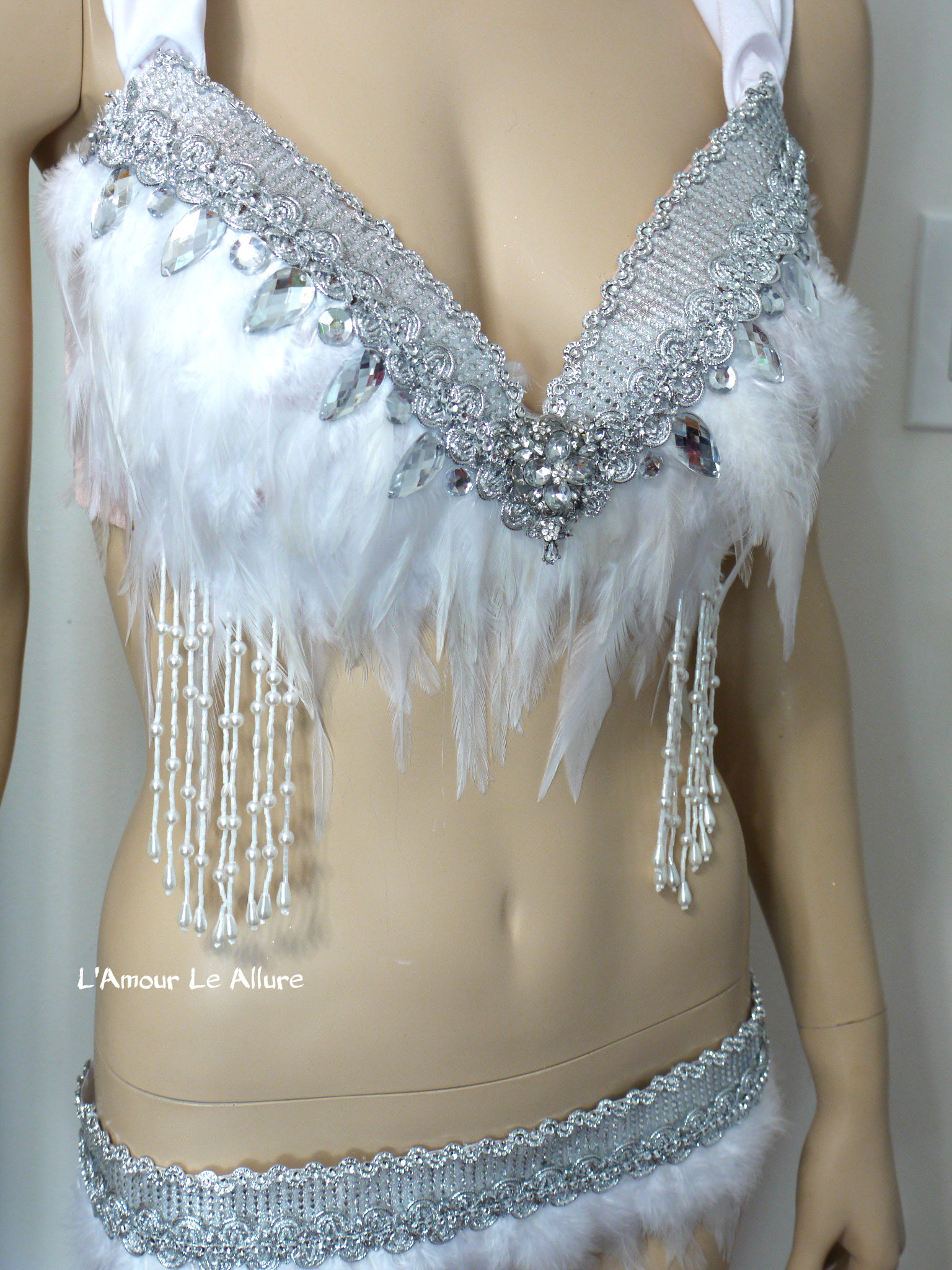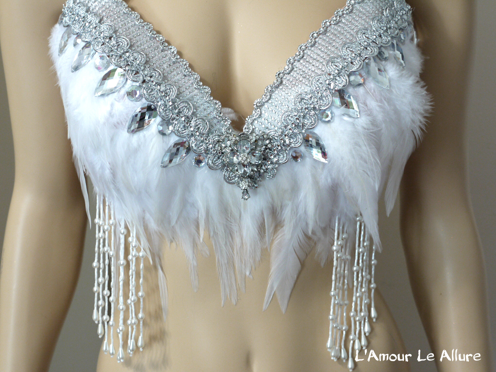 White Diamond Native Fringe Feather Bra Cosplay Dance Costume Rave Bra Halloween Burlesque Show Girl
