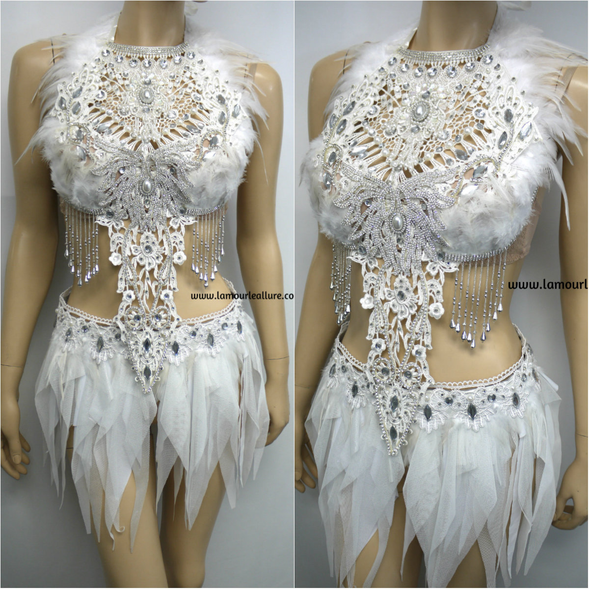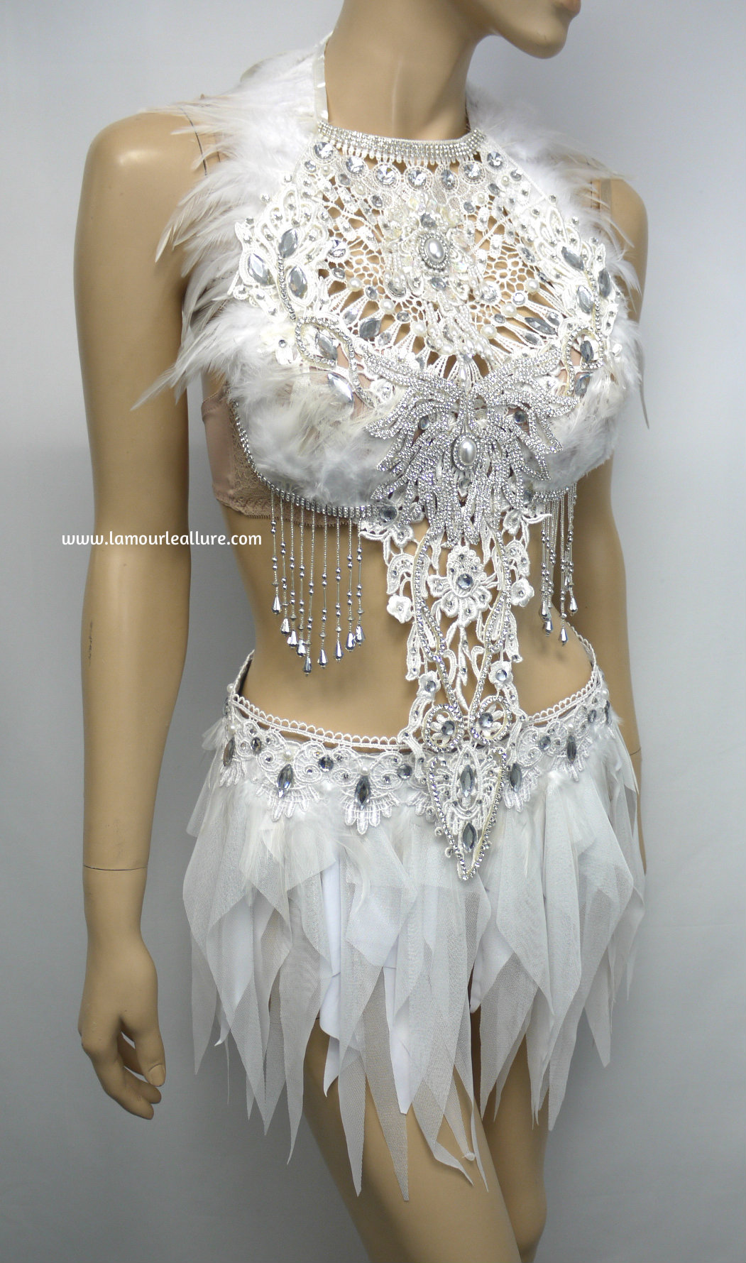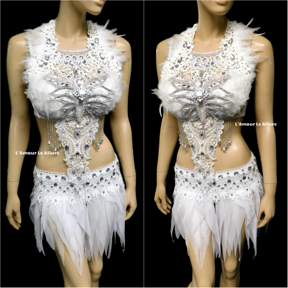 All white Silver Rhinestone Feather Angel Dance Costume Rave Bra and Skirt Halloween