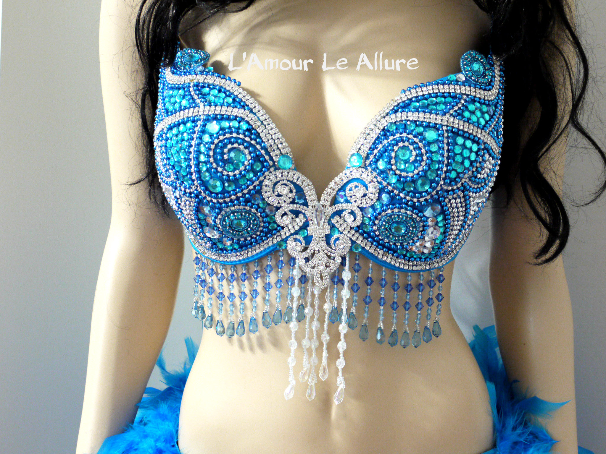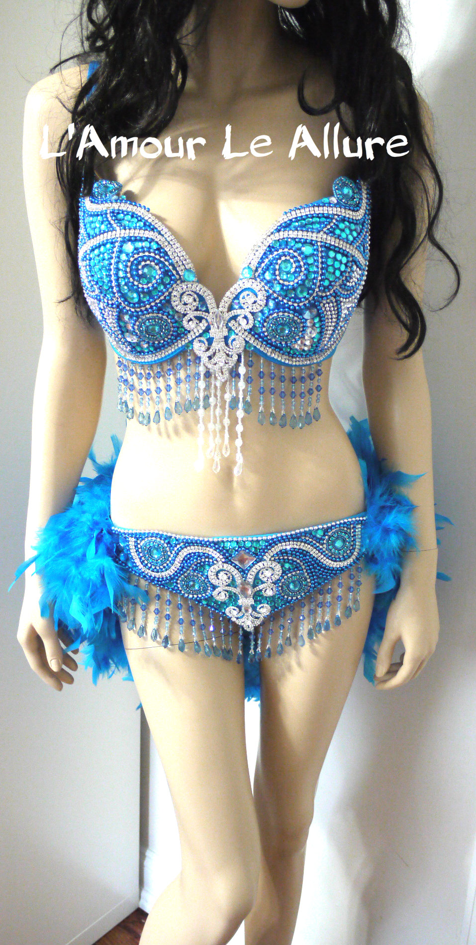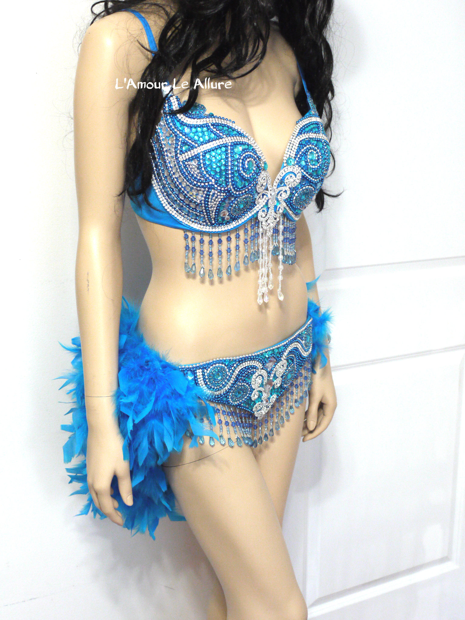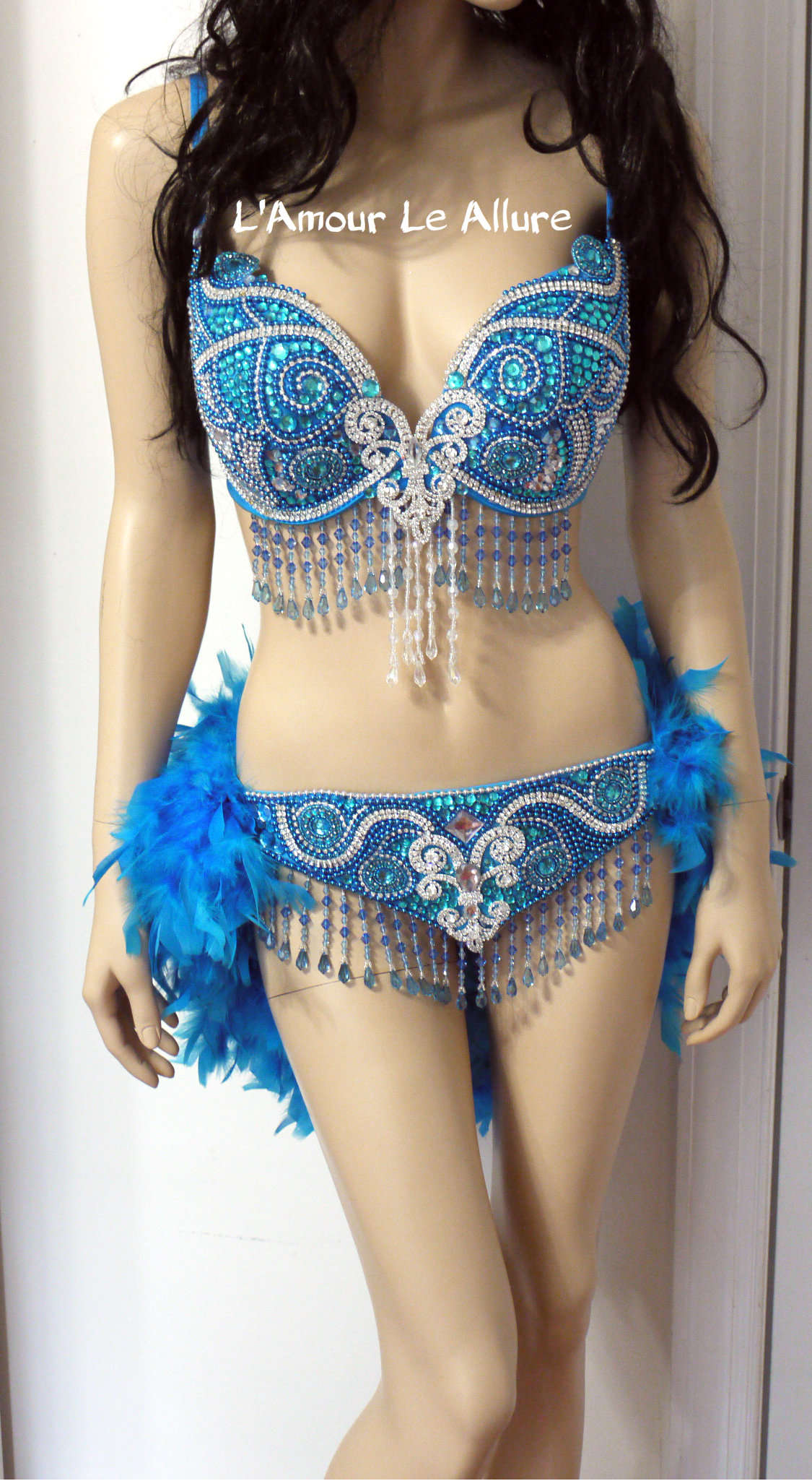Turquoise Butterfly Samba Bra with Feather Bustle Bottom Cosplay Dance Costume Rave Bra Halloween Burlesque Show Girl