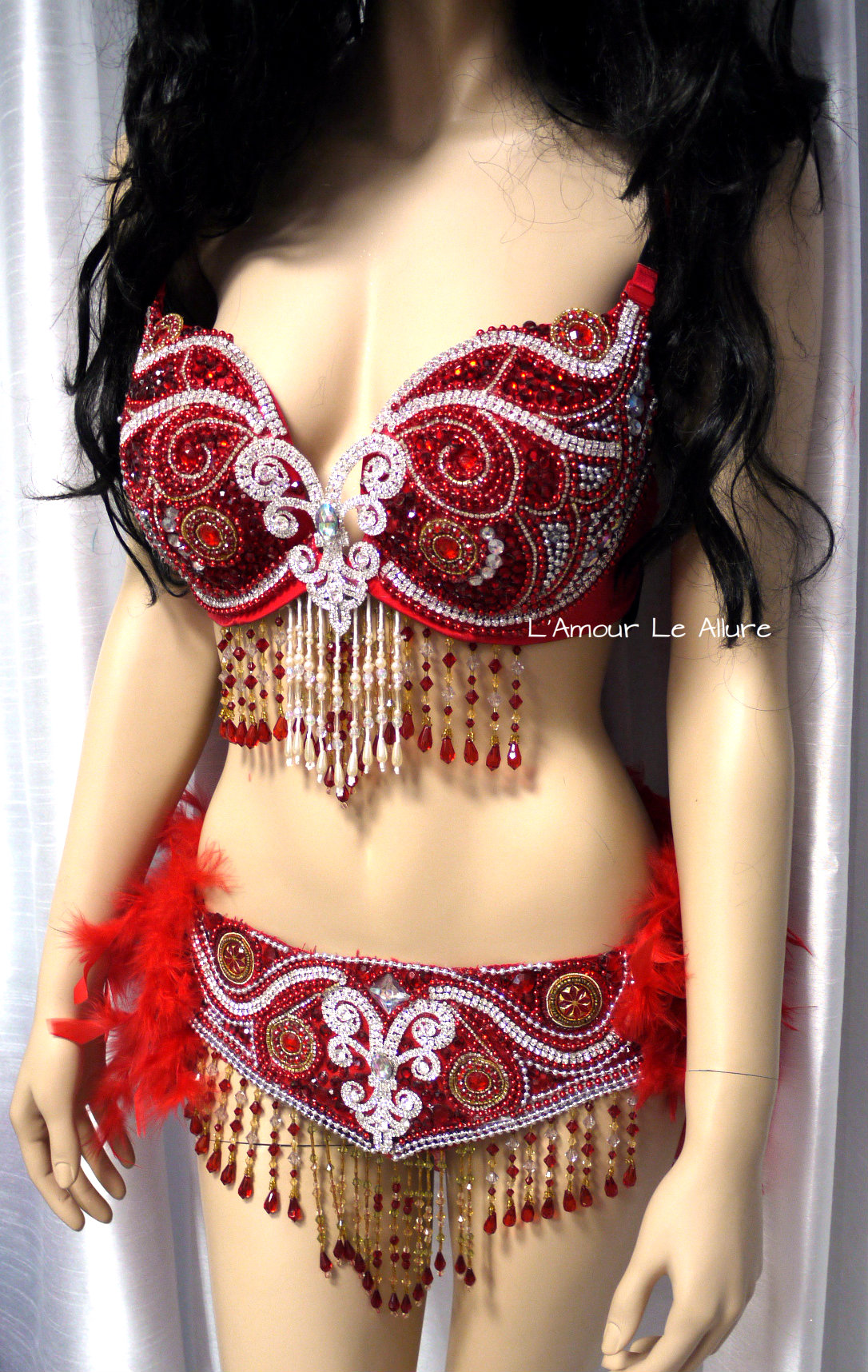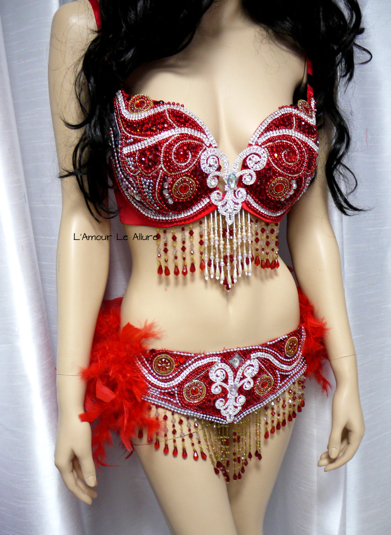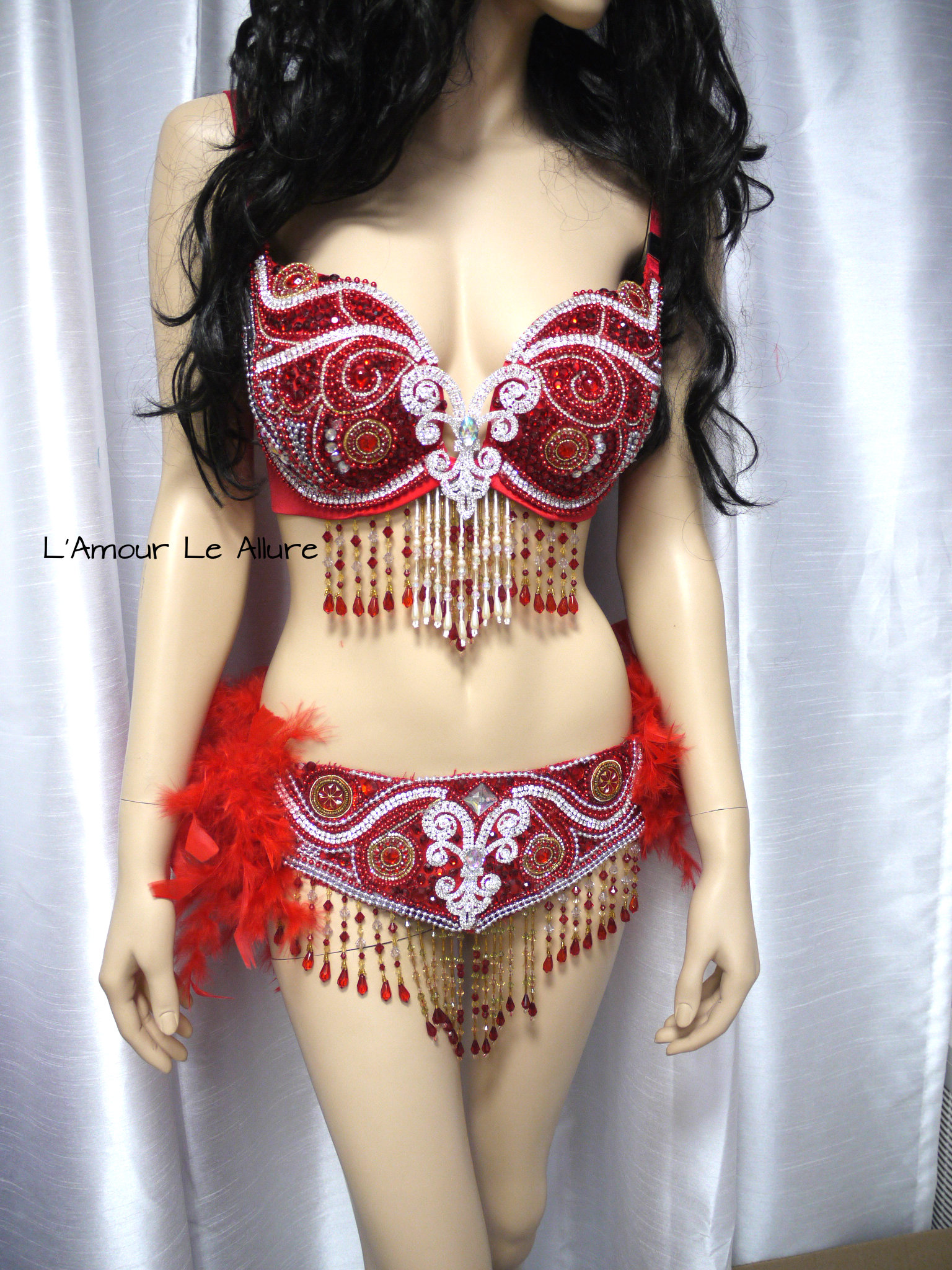 Red Butterfly Samba Bra with Feather Bustle Bottom Cosplay Dance Costume Rave Bra Halloween Burlesque Show Girl