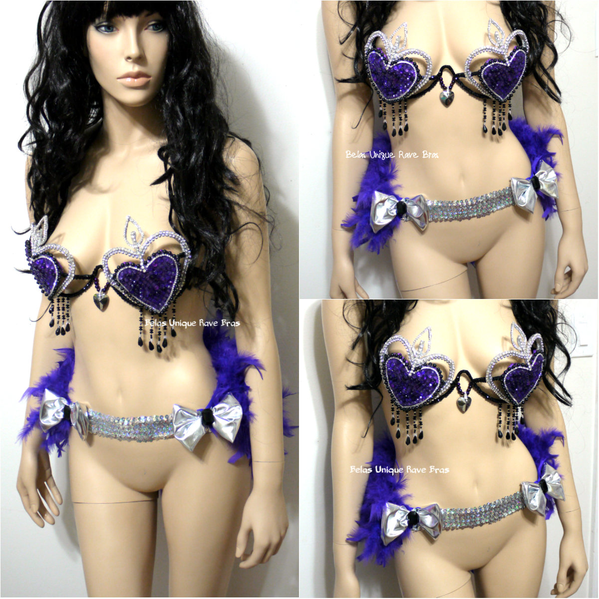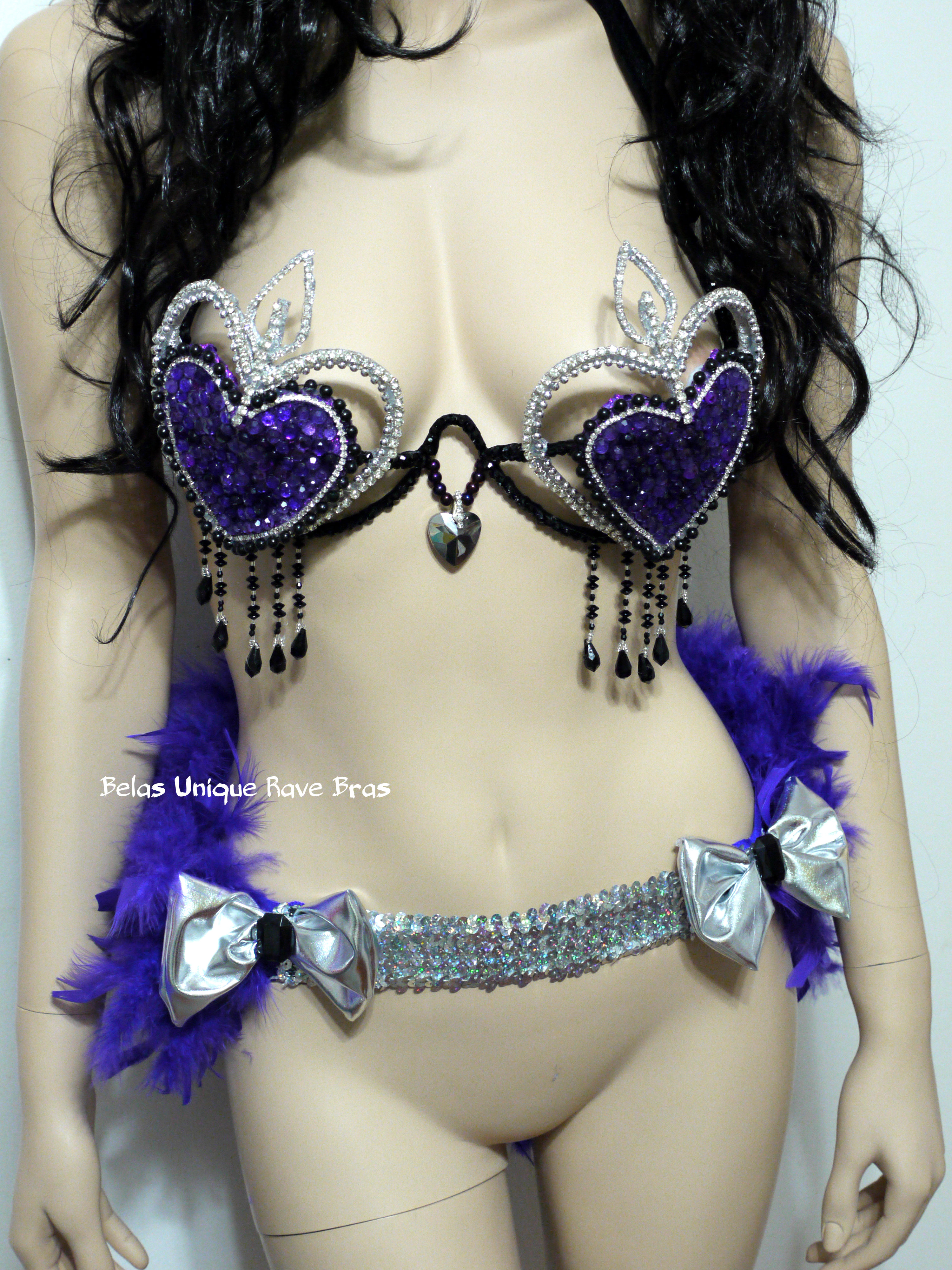 Purple and Silver Heart Samba Cage Bra with Feather Bustle Valentines Day Cosplay Dance Costume Rave Bra Halloween Burlesque Showgirl