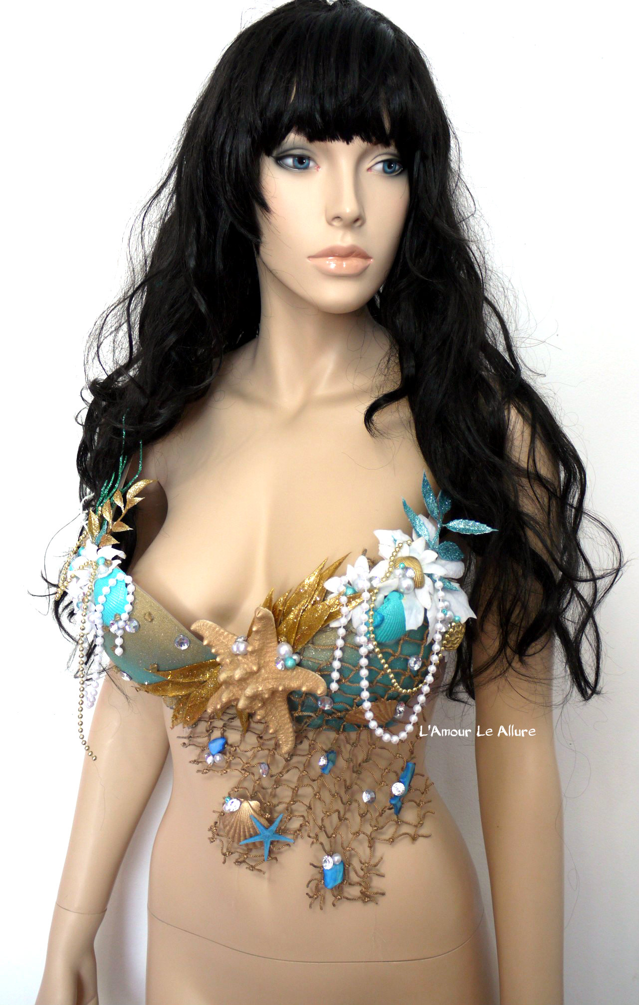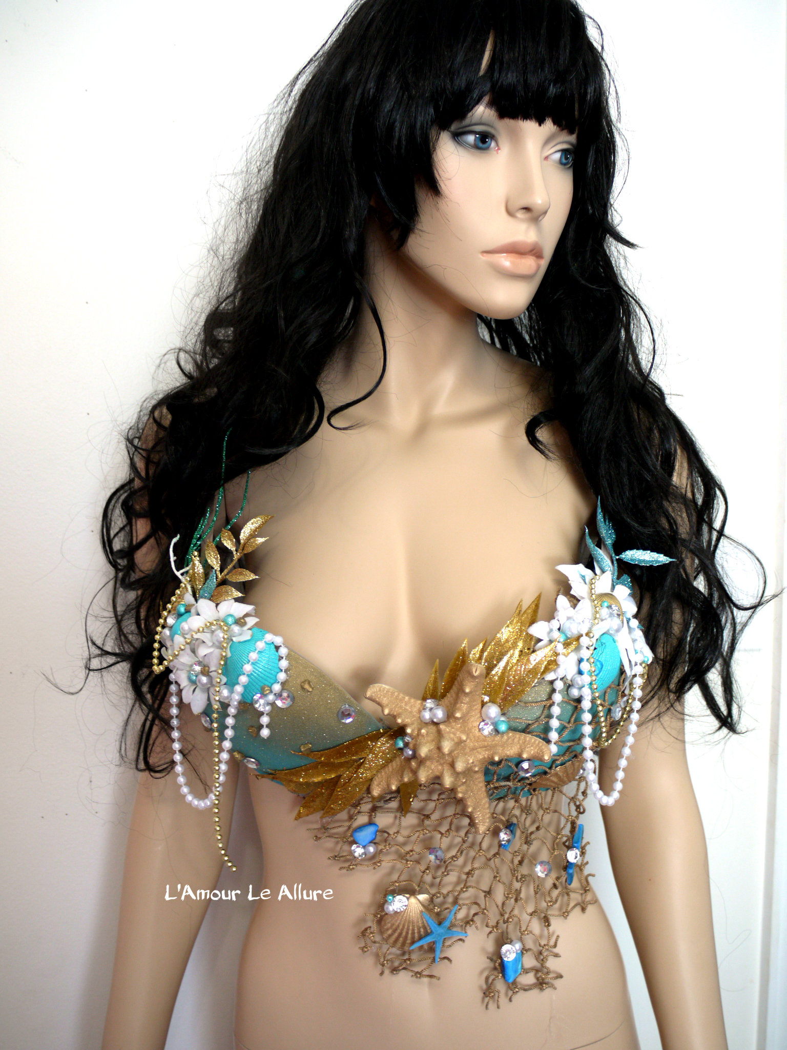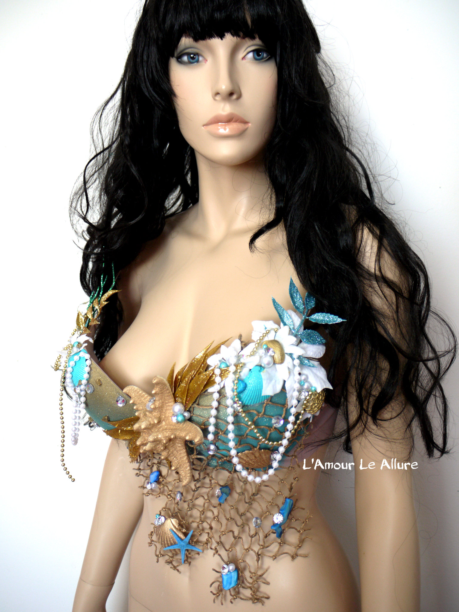 Dripping in Gold Turquoise Mermaid Bra Top Costume Cosplay Dance Costume Rave Bra Rave Wear Halloween Burlesque Show Girl
