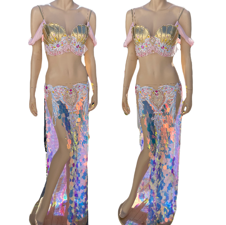 Pink and Gold Sequins Mermaid Siren Belly Dancer 2 Piece